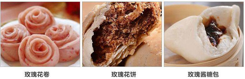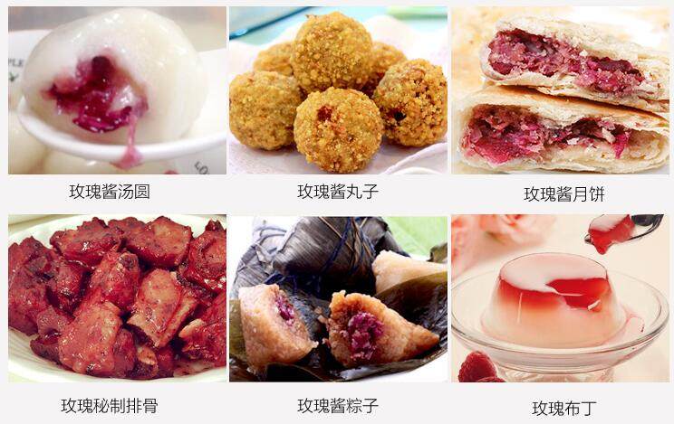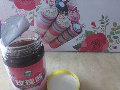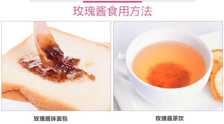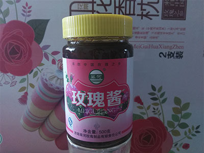 玫瑰酱是将玫瑰鲜花的花瓣用糖腌制的,鲜花进入厂后,平铺在阴凉的通风的室内,经常翻动,防止发热变质,经过1—2天的放置,玫瑰花的花托与花瓣容易分离,剥除花托、花萼后,花瓣的重量约为花重的65%,把混杂在花瓣中的碎叶等杂质挑净后,即可进行腌制。腌制玫瑰酱的糖用纯净的红白糖都可以。比例按花糖1:4,将花瓣加糖后,充分拌匀揉搓,经过充分揉搓的花瓣分层装入瓷缸,压紧。装缸不能装满,以免在其发酵时溢出缸外,之后,放入露天中发酵,为使发酵均匀,开始隔4-5天要翻缸一次,经过2-3次的翻缸,以后就把缸严实地盖好,经过几个月就可食用。