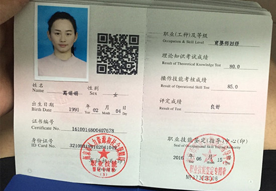 本次学习取得的证书为人力资源和社会保障部颁发的中级育婴师证书,全国通用,职业资格证书网上可查。