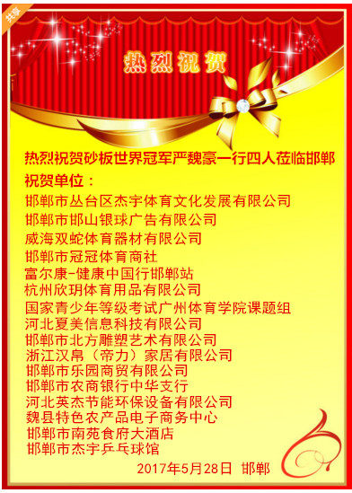 你想目睹世界冠军的风采么?你想观赏高水平的乒乓盛宴么?你了解乒乓球最新流行的技术--砂板乒乓球么?2017年5月28日上午8:30分,由砂板世界冠军严魏豪率领的一行四人莅临邯郸,并与邯郸砂板高手吴刚巅峰对决,由此球友们期待已久的砂板精英争霸赛即将在邯郸市杰宇乒乓球馆隆重登场。