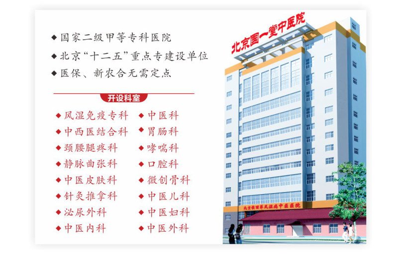北京国一堂中医院始建于1983年,是一所市属综合性、现代化的二级甲等中医医院,北京市“十二五”重点专科建设单位,医保、新农合无需定点报销单位。医院下设多个中医研究院,是全国中医规范诊疗指定基地,在医疗上具有鲜明的特色。
