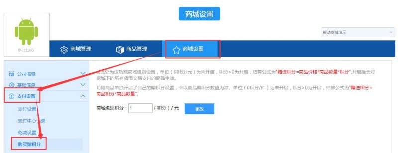 商城管理员可在“商城设置-支付设置-购买送积分”页面进行设置