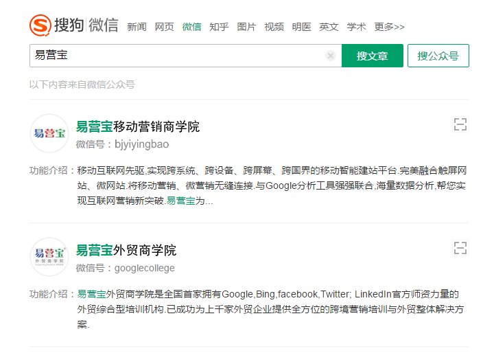 搜狗推出的微信搜索引擎为公众账号开辟了另一片广阔的天地,虽然搜狗的排名机制也处于摸索阶段,但是和微信搜索引擎提供的结果大同小异,二者的规则和机制比较相近,无非都是一些能够直观反映企业公众账号受关注程度和账号活跃度的指标。比如,关键词与名称和功能介绍的匹配度、官方认证结果、公众账号内容的热门度、粉丝活跃度、粉丝数量、文章转发率,等等。须知企业公众账号的微信搜索排名随时在变化,运营者要提高名次,单单抓住一个方面做到极致是远远不够的,必须要把所有因素都考虑在内。
