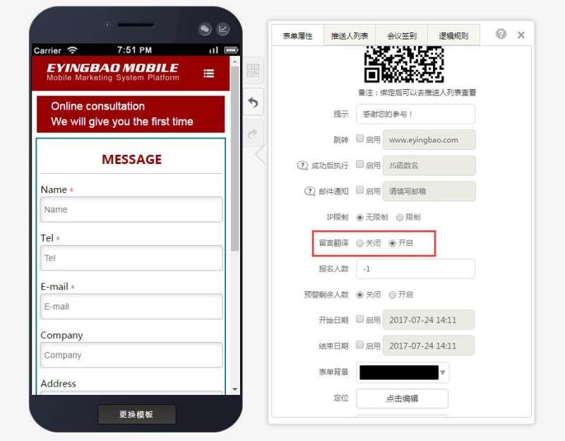 在表单属性里选择留言翻译后,当访客使用非中文语言在线留言后,系统将自动将客户的留言信息翻译成中文,方便管理员快速阅读。