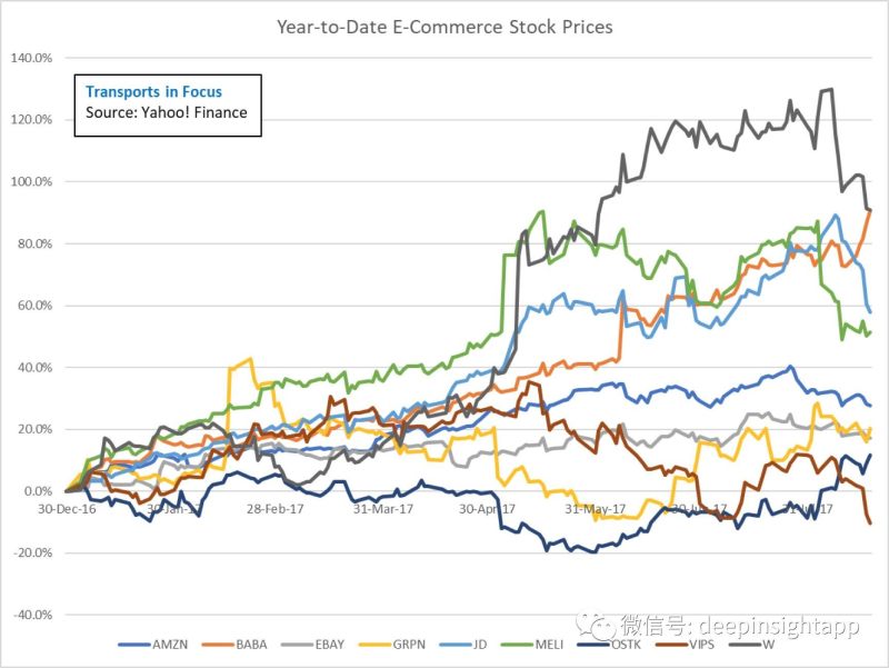 首先,我们先来看看下面这张图:2017年全球主要电商的涨幅榜。