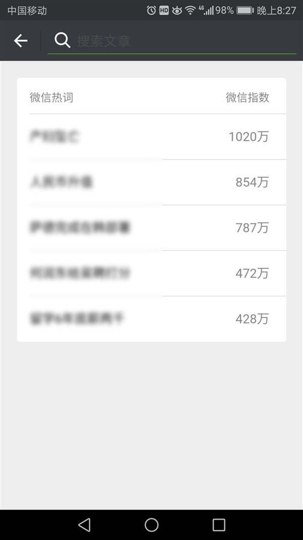 经验证,目前该功能仅显示5个热词,会根据后面对应的微信指数从上到下排列,越靠前证明热度越高。