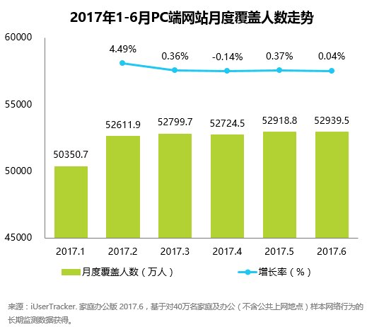 PC端网站覆盖人数在2017年1月-6月间总体保持稳定,仅在1月至2月间受年节影响小幅上涨4.49%,增幅约2000万人,总人数保持在5.2亿人上下。艾瑞分析认为,在PC端网站月度覆盖人数长期趋稳的态势下,节假日等短期因素对网民PC使用行为的影响可能会愈加明显。
