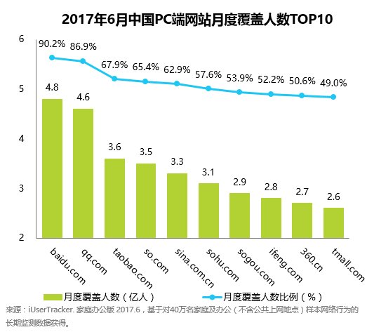 在具体月度覆盖人数头部网站方面,BAT依然聚拢着大量用户人群,其中百度的月度覆盖人数比例超过90%,高居榜首;百度(baidu.com)与腾讯(qq.com)月度覆盖人数均超过4亿人,领跑PC端。艾瑞分析认为,PC网站的传统格局仍未改变,搜索、门户、电商依然是PC端的主要流量入口,且这一态势会持续相当一段时间。