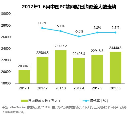 PC端网站上半年日均覆盖人数稳中有升,与月度覆盖人数走势相比,上升趋势更加明显。具体看来,2017年2月PC端网站日均覆盖人数增幅最为明显,达11.2%,5月与6月份增幅则稳定在2.3%左右,有所回落。艾瑞分析认为,综合来看,PC端网站用户活跃度有所增强,使用频次有小幅增加,网民对PC端网站需求依然旺盛,不可忽视。