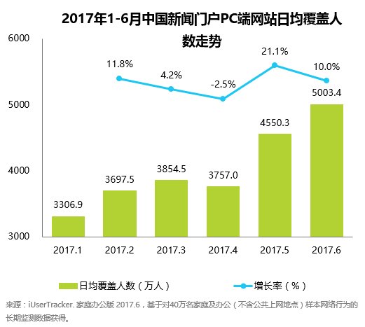 2017年1月至6月,在各类PC端网站中,新闻门户类网站表现更加亮眼,日均覆盖人数大幅增长,从1月份3306.9万人增长为6月份的5003.4万人,涨势惊人。其中,日均覆盖人数月增长率最高超过20%。艾瑞分析认为,近一段时间以来内容行业的爆发式发展对于新闻门户类网站助益颇多。各巨头对优质内容的重视程度不断提高,在客观上促进了优质内容的大量出产和投放,内容的繁荣和多元化也进一步吸引了用户,新闻门户类网站对用户的渗透力将随之继续提高。
