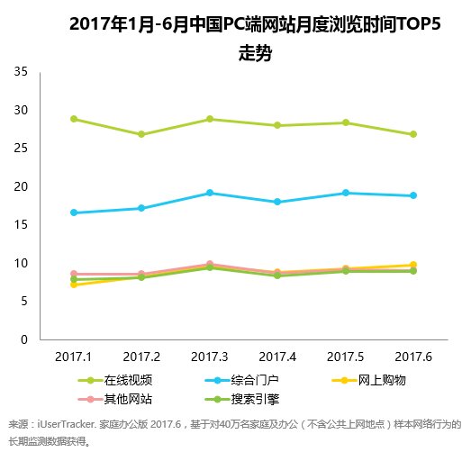 在月度浏览时间方面,在线视频凭借自身特性依旧领先一个身位。据艾瑞PC指数显示,在线视频2017年1月至6月月度浏览时间长期稳定在28亿小时上下,较第二名综合门户高出近10亿小时。网上购物和搜索引擎分列第三、第五位,无缘十亿级门槛,但仍在持续小幅增长。