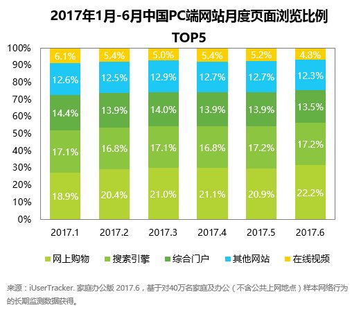 然而从月度页面浏览比例上看,在线视频占比相对较少,且仍在持续走低。网上购物则在此项中占比第一,保持着小幅稳定增长态势。艾瑞分析认为,随着电商网站的内容化趋势和各种营销活动的频频举办,用户不再是一种“买完即走”消费模式,多样的优质内容和促销信息对于用户产生了更大的吸引力,用户较之前会在电商网站浏览更多页面,找寻和消费更多感兴趣的内容。