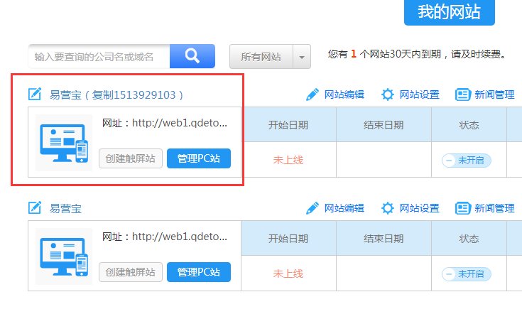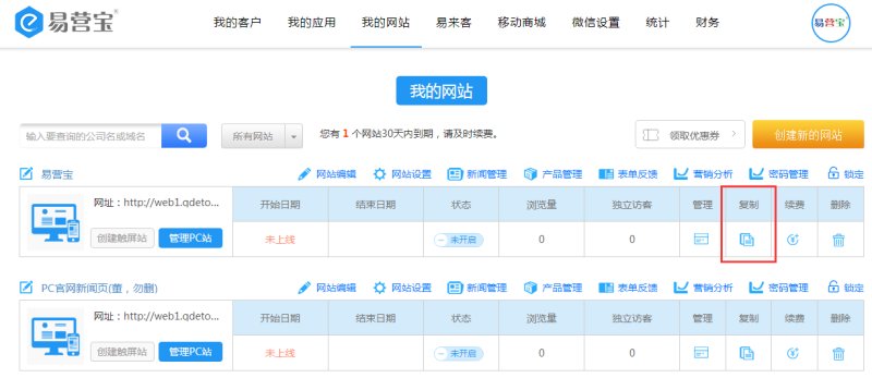 登录易营宝后台,选择你要翻译的网站,点击“复制”按钮