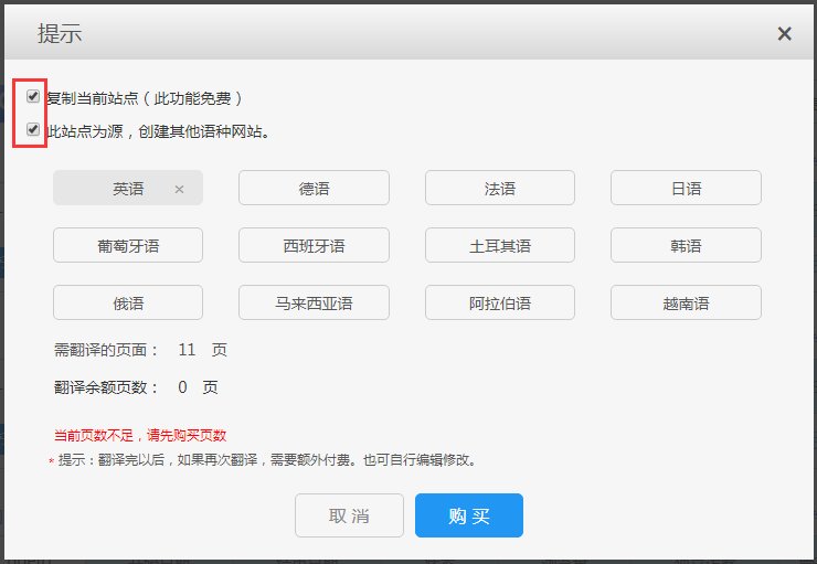 在弹窗里选择“以此站点为源,创建其他语种网站”,选择你要翻译的语种