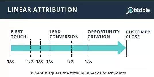 线性归因模型是多触点归因模型中最简单的一种。它将权重平均划分给购物旅程中的每一个触点。