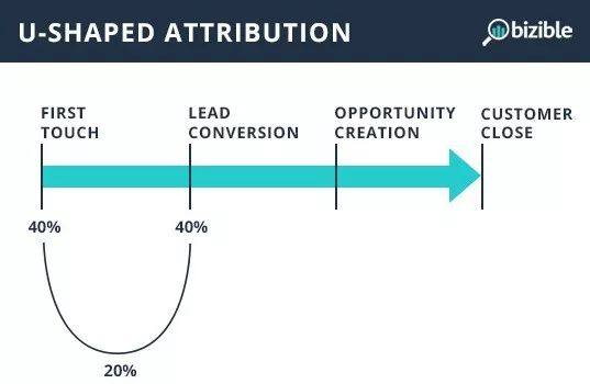 U型归因模型,Google也称为基于位置的归因模型,对于重视销售线索产生的营销团队而言是一个伟大的多触点归因模型。它是一种可以追踪每一个触点的多触点模型,与平均分配权重给每个触点的线性归因模型不同,它强调的是两个关键触点的重要性:第一次把新客人带来的首次触点和线索转化触点。在该模型里,这两个触点分别能得到40%的权重,而其他剩余的触点则会平分剩下来的20%的权重。