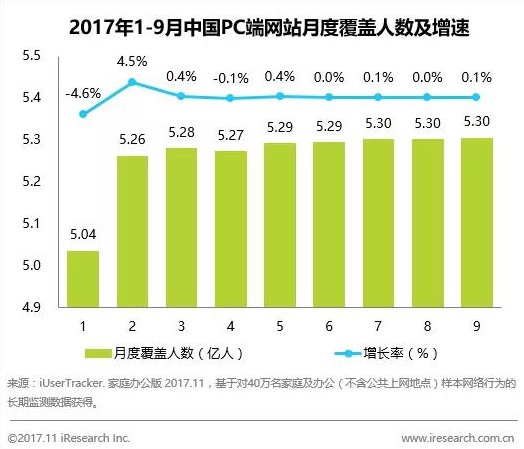 2017年1-9月,PC端月度覆盖人数增长几近停滞,除二月份受春节影响出现小幅高峰,月度覆盖人数基本稳定在5.3亿人左右。