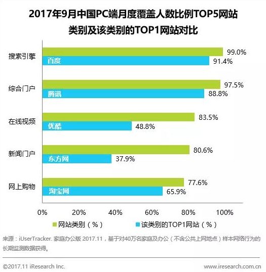 其中,使用搜索引擎和综合门户网站的人数比例最高,分别为99.0%和97.5%,占据PC端流量主入口。在线视频、新闻门户以83.5%和80.6%分列三、四位。购物类网站相对较低,为77.6%。从各类别的TOP1网站来看:百度、腾讯、淘宝网的覆盖人数比例分别为91.4%、88.8%、65.9%,PC端领先地位明显。而在视频和新闻门户类网站中,TOP1网站优酷和东方网的覆盖比例均未超过50%,分别为48.8%和37.9%,与该类别总覆盖人数比例相差较多。由此可见,虽然PC端用户较为关注视频和新闻类别,但网站选择上相对分散,集中度较低。