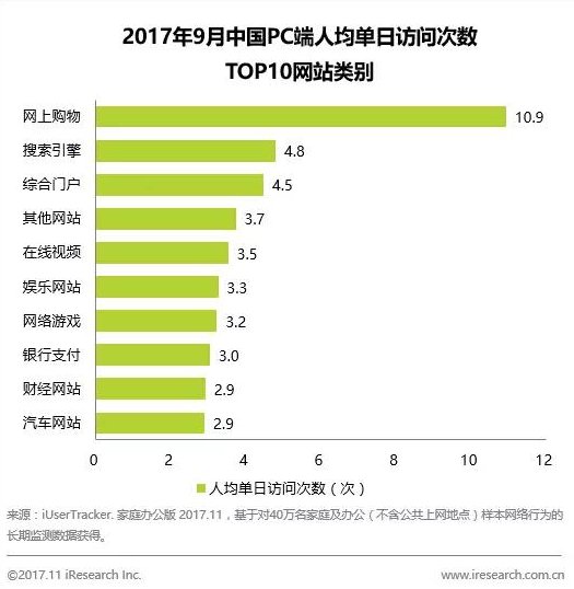 从使用频次上看,购物类网站以人均单日使用10.9次遥遥领先。搜索和门户类网站占据二、三名,分别为4.8、4.5次。在线视频、娱乐网站、网络游戏,以3.5、3.3、3.2排在第五-七名。垂直类资讯网站中,财经和汽车话题热度明显,人均单日访问2.9次。