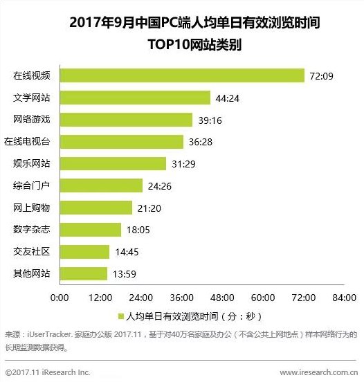 娱乐是PC端用户的重度需求,体现在使用时长上,娱乐类网站包揽前五。在线视频以人均单日使用72分钟排在了第一,文学网站、网络游戏、在线电视台、娱乐网站排在第二-五名,人均单日使用时间均超过30分钟。综合门户、网上购物、数字杂志类网站,排在第六-八名,人均单日使用时间分别为24、21和18分钟。交友社区由于交流本身的特性,用户黏性更强,达到14分钟。