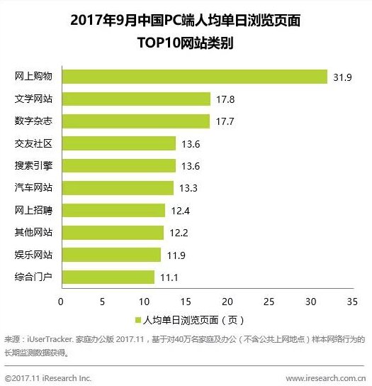 从网站使用深入程度看,网上购物以人均单日浏览31.9页排在首位,反映用户的购物习惯,可能需要多方挑选,或者打开多个页面进行比较,从而完成购物决策。文学网站和数字杂志因为自身文字多,页数多的特性,也排到了前三名,人均单日浏览17.8、17.7页。而交友社区促使用户间的交流更深入,不仅增加了用户的使用时间,也增加了用户的浏览页数,达到13.6页。汽车网站作为垂直类别,表现较为亮眼,以人均浏览13.3页排在第六。网上招聘因信息繁多,用户浏览起来非常细致,以人均单日浏览12.4页排在第七。