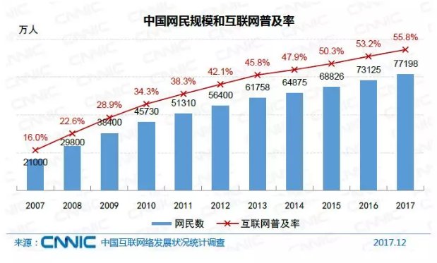 1月31日,中国互联网络信息中心(CNNIC)发布的最新报告显示,截至2017年12月,中国网民规模达7.72亿,普及率达到55.8%,超过全球平均水平4.1个百分点,超过亚洲平均水平9.1个百分点。