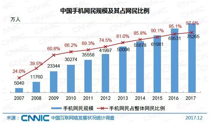 截至2017年12月,我国手机网民规模达7.53亿,网民中使用手机上网人群的占比由2016年的95.1%提升至97.5%;与此同时,使用电视上网的网民比例也提高了3.2个百分点,达28.2%;台式电脑、笔记本电脑、平板电脑的使用率均出现下降,手机不断挤占其他个人上网设备的使用。
