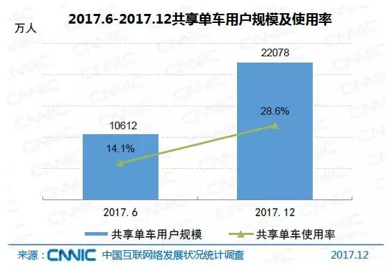 数据显示,共享单车成为2017年下半年用户规模增长最为显著的互联网应用类型。截至2017年12月,共享单车国内用户规模已达2.21亿,占网民总体的28.6%,用户规模半年增加1.15亿,增长率达到108.1%。