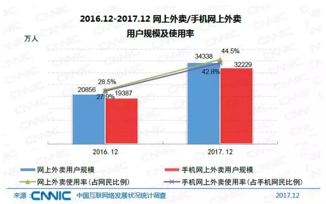 截至2017年12月,我国网上外卖用户规模达到3.43亿,较2016年底增加1.35亿,同比增长64.6%,继续保持高速增长。其中,手机网上外卖用户规模达到3.22亿,增长率为66.2%,使用比例达到42.8%,提升14.9个百分点。