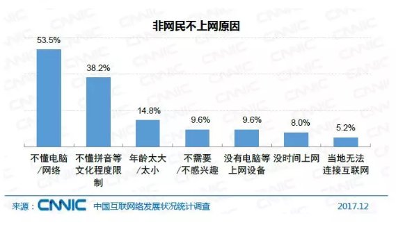 截至2017年12月,我国非网民规模为6.11亿,其主要原因为上网技能缺失以及文化水平限制。