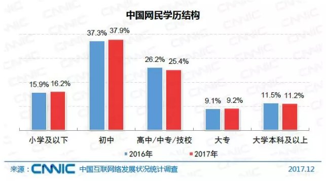 网民中具备中等教育水平的群体规模最大。截至2017年12月,初中、高中/中专/技校学历的网民占比分别为37.9%、25.4%,其中,初中学历网民占比较2016年底增长0.6个百分点。
