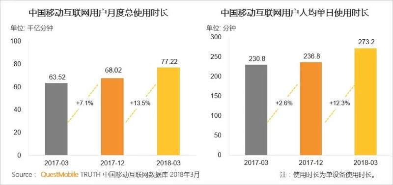 4月17日,国内知名大数据服务商QuestMobile发布《移动互联网2017春季报告》。总体上看,2018年3月份,移动用户数已经接近11亿(10.9亿),增长率也跌到了5.4%,不得不说,这个“新常态”来的有点快。这种增长趋缓,在用户时长等方面,也都表现明显。