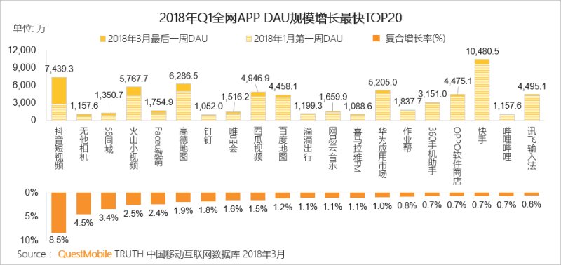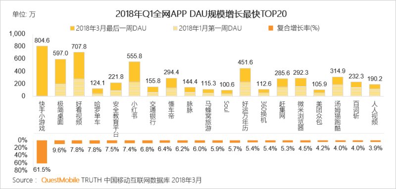 2018年Q1全网APP日活跃用户规模增长最快TOP20(DAU在100万-1000万)
