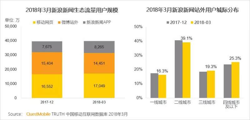 QuestMobile Plus生态流量审计结果显示,新浪新闻站外流量占比已经达到79%;而从站外用户的城市分布来看,三四线及以下城市用户占比上升,用户下沉现象明显。