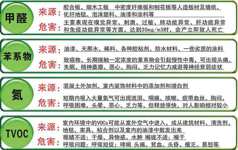 除家具外,室内常用的装修材料,如油漆、涂料、地板革、壁纸、胶合板、塑料、类聚氯乙烯(PVC)板、保温材料,以及室内人造板材,如大芯板、曲柳等各种胶合贴面板、密度板的家具和美术作品等,都会释放出挥发性有机化合物。美国环保局已鉴定出350种,以芳香烃类和脂肪烃类为主。不同装饰材料的污染期也不尽相同。